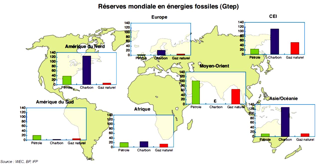 Les ressources des principales énergies primaires (pétrole, gaz, charbon, uranium) sont réparties de façon inégale sur notre planète.