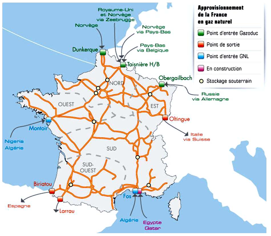Le transport par gazoducs est privilégié. Soit terrestre (Russie, Pays-Bas), soit sous-marin ( Norvège).