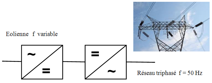 pour ensuite convertir le continu en alternatif de fréquence fixe f = 50 Hz pour que le système