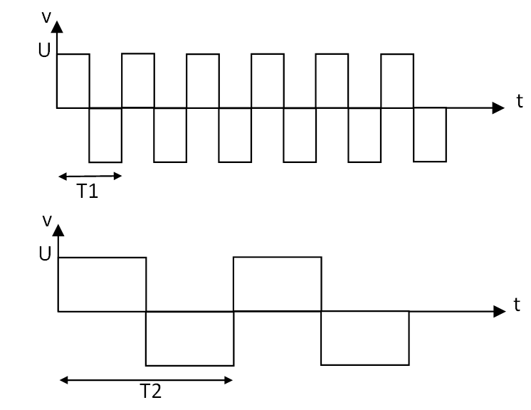 l'onduleur fait varier la fréquence ( la période T ) de la tension v :