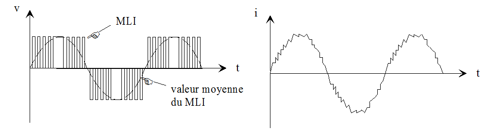 La commande MLI permet d'obtenir une valeur moyenne de la tension v sinusoïdale ce qui permet