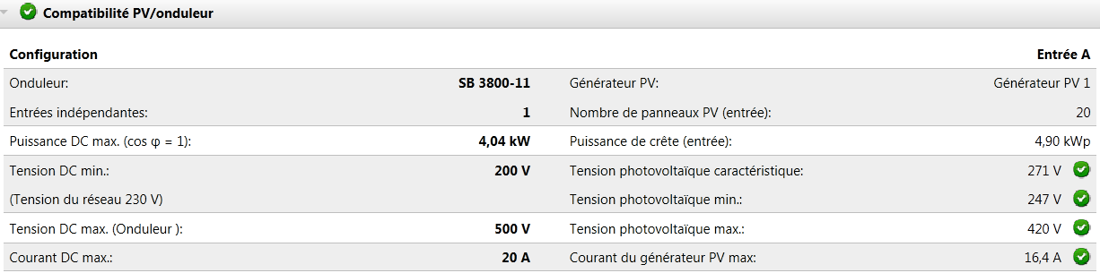 Sélectionner " Le logiciel vous propose tous les onduleurs compatibles avec le projet Sélectionner l'onglet "Générateur PV1" Puis à l'aide des flèches de navigation, trouver l'onduleur le plus adapté à votre projet (toutes les cases vertes foncées correspondent aux onduleurs les plus appropriés) Le sélectionner puis cliquer sur " puis cliquer sur " Vous obtenez alors la compatibilité de l'onduleur avec votre projet ainsi que ses caractéristiques puissances - montage (Strings*)... * String = ligne de panneaux montée en série |