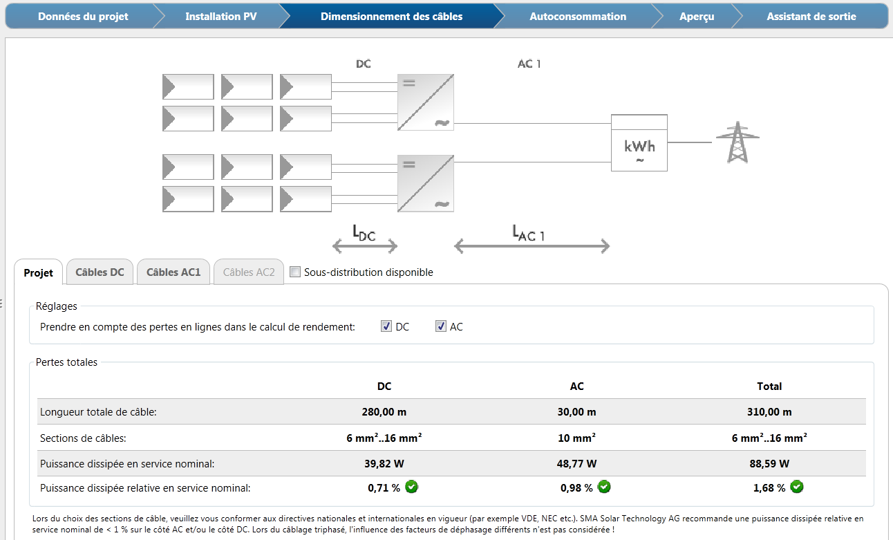 Sélectionner l'onglet "Dimensionnement des câbles" Afin de prendre en compte les pertes énergétiques dans ceux-ci. Suivre les indications du champ