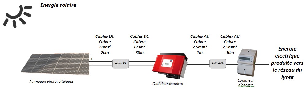 Le champ photovoltaïque est composé de 2 strings (chaînes de panneaux en série) de 12 modules BP275. Ces 2 chaînes sont montées en parallèle dans le coffret DC à l'aide de conducteurs de 6mm² en cuivre.