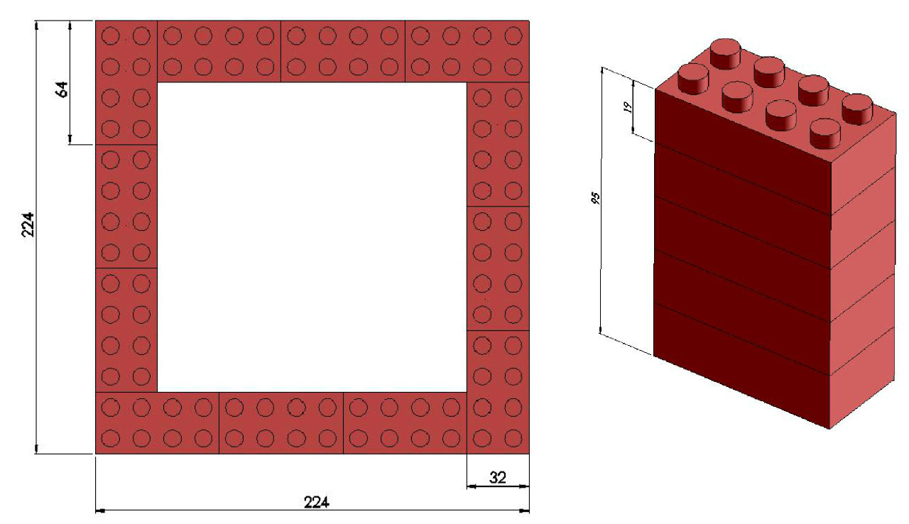 - L'encombrement de la maison doit respecter le volume des autres coffrets thématiques. Les dimensions extérieures au sol de la maison seront de 224 x 224 et la hauteur de la façade fixée à 95 mm (5 briques empilées)
