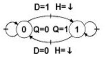 Au front descendant (↓H) du signal d'horloge H, la donnée présente sur D est transférée (recopiée) en sortie Qt+ = Dt- . En l'absence de front descendant d'horloge, la sortie conserve son état Qt+ = Qt-.