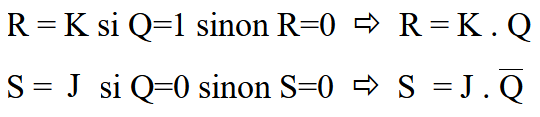 Nous allons donc valider la mise à 0 (appelée K) si la sortie est à 1, et la mise à 1 (appelée J) si la sortie est à 0, ceci à partir d’une bascule RSH.
