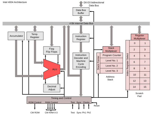 Jusqu'au début des années 1970, les différents composants électroniques nécessaires au fonctionnement d'un processeur ne pouvaient pas tenir sur un seul circuit intégré, ce qui nécessitait d'interconnecter de nombreux composants dont plusieurs circuits intégrés. En 1971, la société américaine Intel réussit, pour la première fois, à placer tous les composants qui constituent un processeur sur un seul circuit intégré, donnant ainsi naissance au microprocesseur.