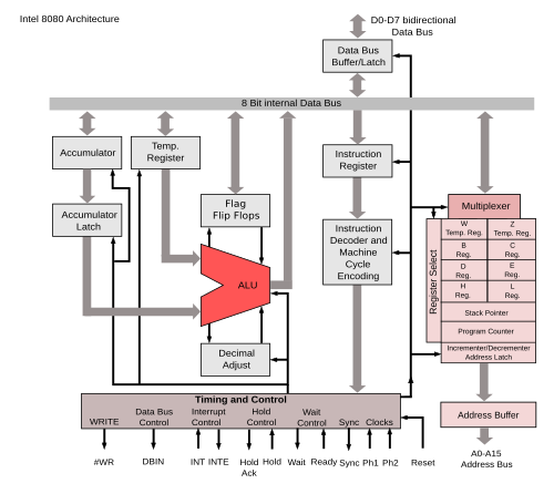 L'Intel 8080 est le successeur de l'Intel 8008, dont il corrige plusieurs limitations. Le 8080 était vendu dans un pack DIP à 40 broches, ce qui lui permettait d'utiliser un bus d'adresses sur 16 bits et un bus de données sur 8 bits, donnant un accès facile à 64 Ko de mémoire. Il a sept registres de 8 bits (dont six peuvent être combinés dans trois registres de 16 bits), un pointeur de pile sur 16 bits (remplaçant la pile interne des 8008), et un compteur de programme sur 16 bits. Le 8080 possède 256 ports d'entrées/sorties accessibles par des instructions dédiées. Contrairement à certains processeurs pour lesquels les unités d'entrée/sortie sont accessibles dans l'espace d'adressage mémoire, cette configuration permet d'économiser l'espace d'adressage restreint du 8080. |