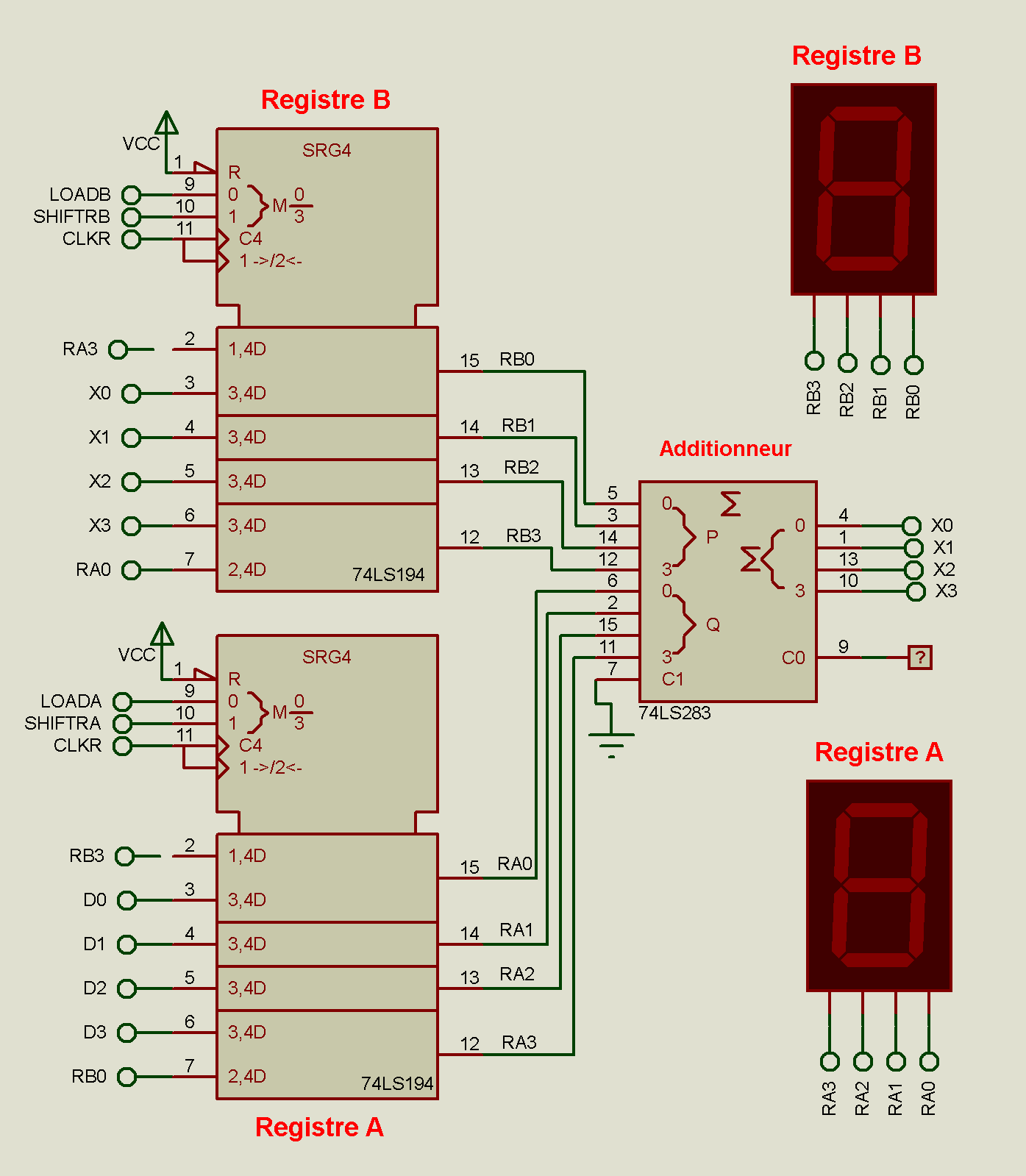 Pour l'instruction ADD nous devons relier les sorties de l’additionneur 74LS283 (nommées X3 .. X0) aux entrées Din (Broches 6,5,4 et3) du Registre B et fixer un niveau logique Haut sur les entrées que nous nommerons LoadB et ShiftRB (broche 9 et 10) suivi d'un front montant de ClkR.