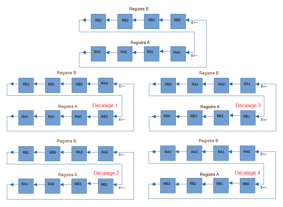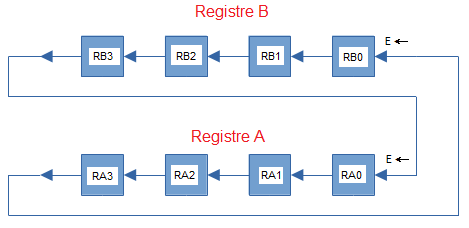 Pour l'instruction EXchanGe (A ⇔ B), qui sera réalisée à l'aide de 4 décalages circulaires à gauche successifs, il faudra relié RB0 à l'entrée décalage gauche "E←" du registre A (broche 7) et fixer LoadA au niveau Bas et ShiftRA au niveau Haut. II en sera de même pour le registre B, RA0 connectée à l'entrée décalage gauche "E←" du registre B.