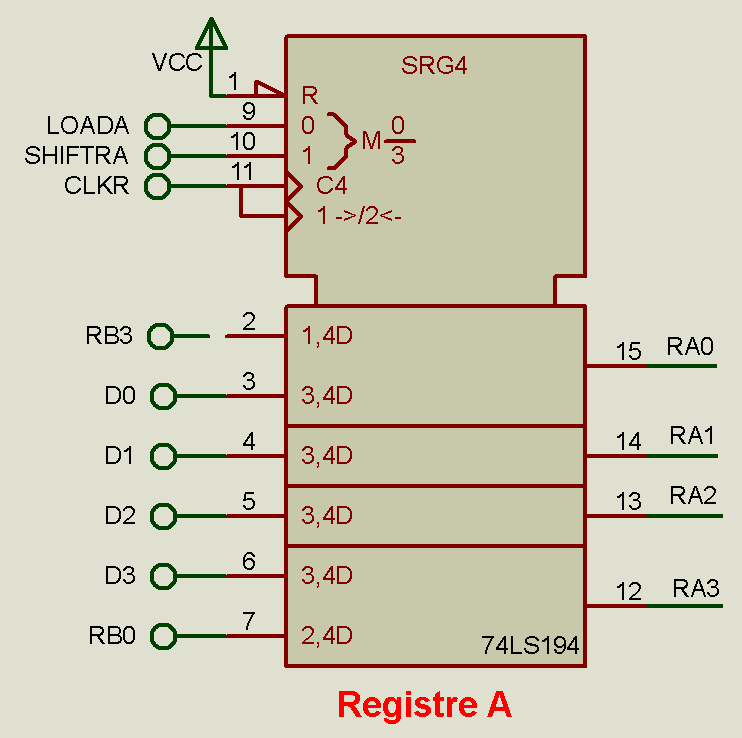 Pour l'instruction LDA #x qui réalise un chargement parallèle (parallel load) synchrone du registre, nous devons relier le bus de donnée (D3 .. D0) aux entrées Din (Broches 6,5,4 et3) du Registre A et fixer un niveau logique Haut sur les entrées que nous nommerons LoadA et ShiftRA (broche 9 et 10) suivi d'un front montant de ClkR.