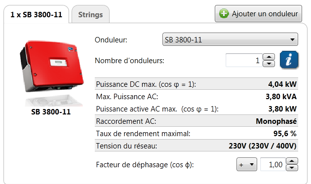 Sélectionner " Le logiciel vous propose tous les onduleurs compatibles avec le projet Sélectionner l'onglet "Générateur PV1" Puis à l'aide des flèches de navigation, trouver l'onduleur le plus adapté à votre projet (toutes les cases vertes foncées correspondent aux onduleurs les plus appropriés) Le sélectionner puis cliquer sur " puis cliquer sur " Vous obtenez alors la compatibilité de l'onduleur avec votre projet ainsi que ses caractéristiques puissances - montage (Strings*)... * String = ligne de panneaux montée en série |