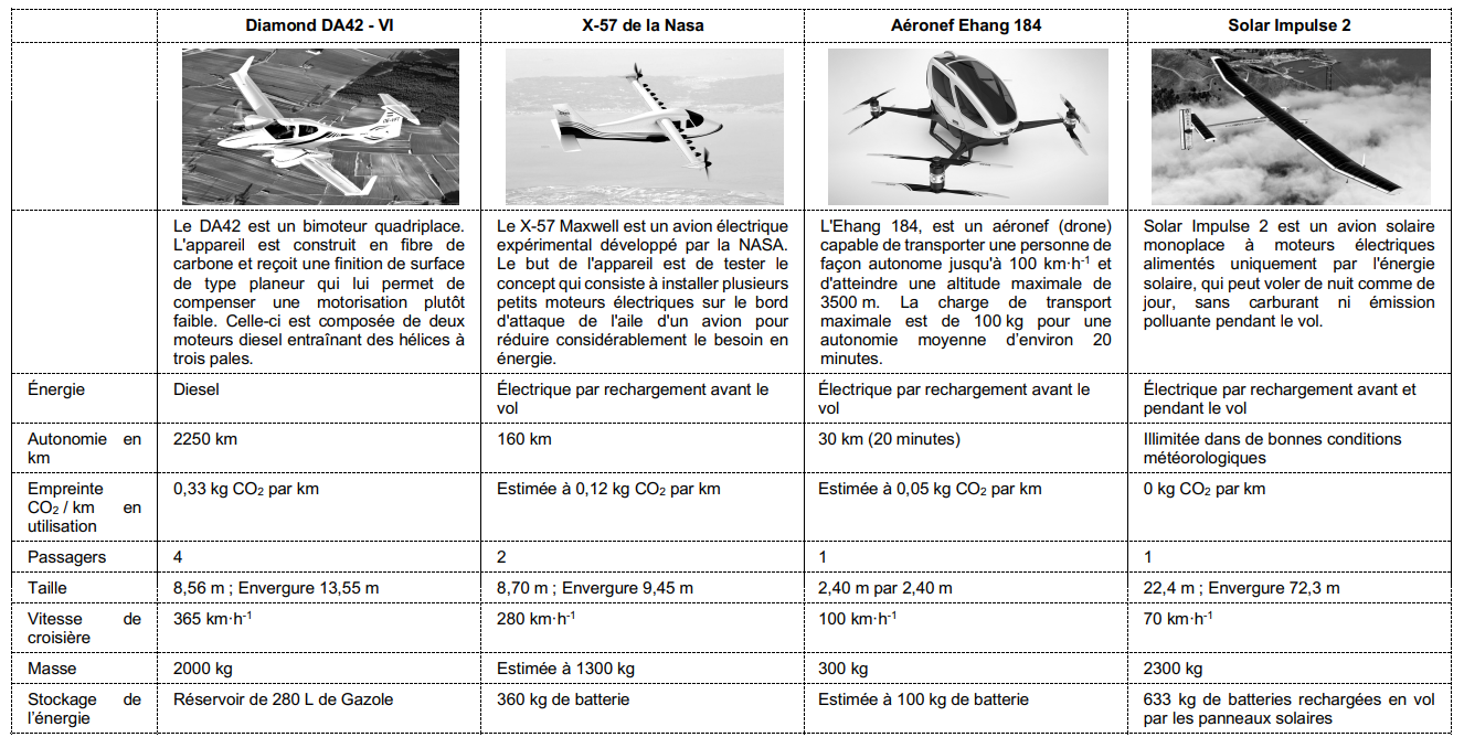 On donne le tableau comparatif de 4 modèles d'avion léger.