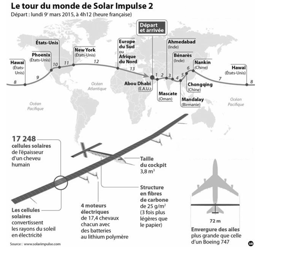 Pour ce travail complémentaire, nous allons nous intéresser à l'avion Solar Impulse. Entre mars 2015 et juin 2016, les pilotes Bertrand Piccard et André Broschberg ont réussi un tour du monde historique en avion à énergie solaire, le Solar Impulse 2, un appareil autonome en énergie et silencieux. Volant de jour comme de nuit (grâce aux batteries) et sans carburant, l’avion a parcouru plus de 43 000 km en 600 heures de vols effectifs, répartis sur 17 étapes en solitaire (au lieu de 13, prévues initialement).