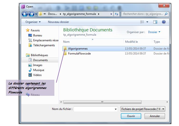 Naviguer vers le dossier du TP puis choisir le fichier en question dans le dossier Algorigrammes :