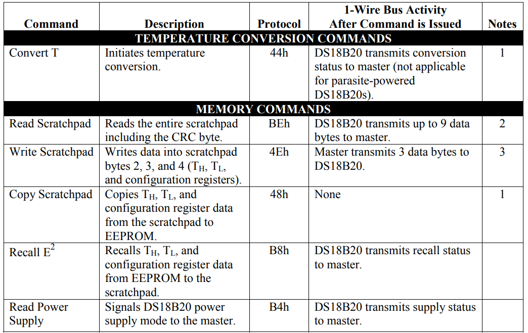 Ces commandes de fonction sont propres à chaque périphérique One Wire. Prenons comme exemple les commandes de fonction du périphérique DS18B20.