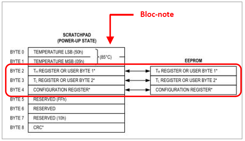 Cette commande replace les valeurs correspondant aux registres TH, TL et Configuration de l’EEPROM vers le bloc-note. Pendant cette opération, le périphérique (DS18B20) transmet un « 0 » puis lorsque l’opération est terminée, place une « 1 »