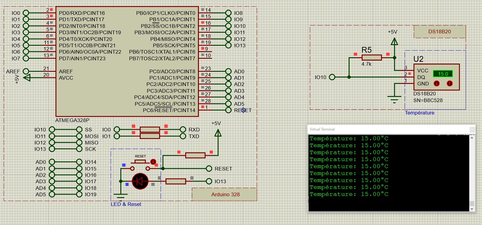ds.reset(); // On reset le bus 1-Wire ds.select(addr); // On sélectionne le DS18B20 ds.write(0x44, 1); // On lance une prise de mesure de température delay(800); // Et on attend la fin de la mesure > 750ms ds.reset(); // On reset le bus 1-Wire ds.select(addr); // On sélectionne le DS18B20 ds.write(0xBE); // On envoie une demande de lecture du scratchpad for (byte i = 0; i < 9; i++) // On lit le scratchpad data[i] = ds.read(); // Et on stock les octets reçus // Calcul de la température en degré Celsius *temp = ((data[1] << 8) | data[0]) * 0.0625; // Pas d'erreur return true; } // setup() void setup() { Serial.begin(9600); // Initialisation du port série } // loop() void loop() { float temp; // Lit la température ambiante à ~1Hz if(getTemperature(&temp)) { // Affiche la température Serial.print("Température: "); Serial.print(temp); Serial.write(176); // caractère ° Serial.write('C'); // Celsius Serial.println(); } }
