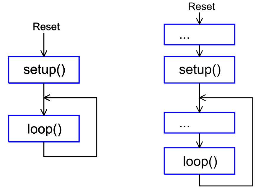 L’organigramme de gauche correspond à ce que voit l’utilisateur. Mais en fait, derrière l’usage de setup() et loop() proposé par Arduino, des instructions cachées s’exécutent avant chacune de ces procédures, comme le montre l’organigramme de droite.