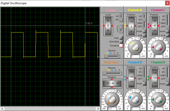 En simulation sous Proteus on vérifie que le signal sur S_OUT est bien de 1 Hz