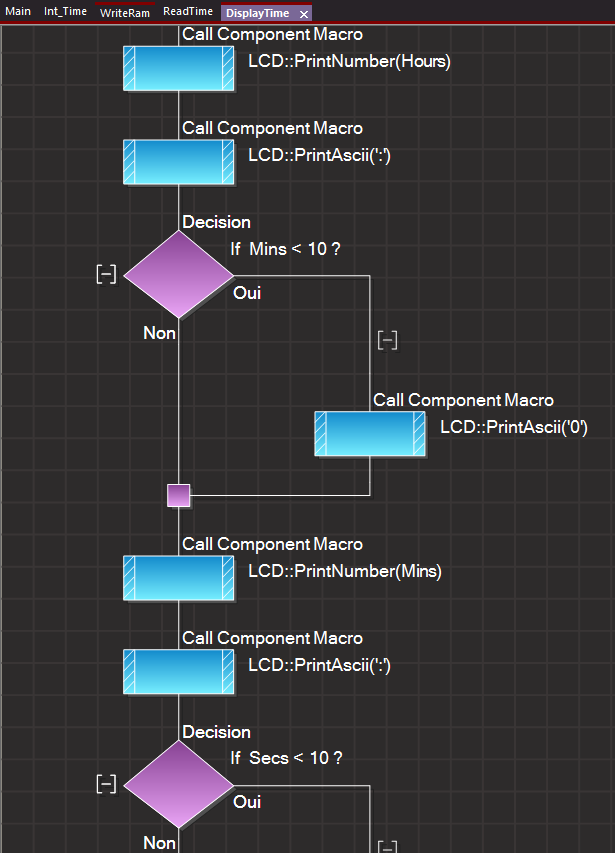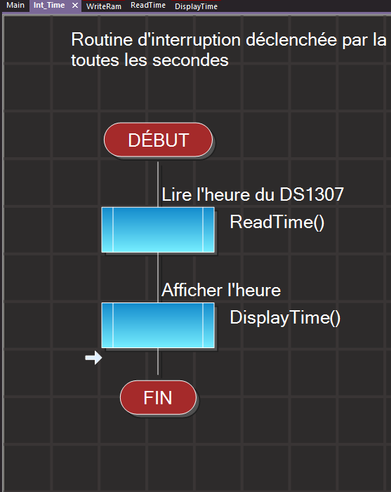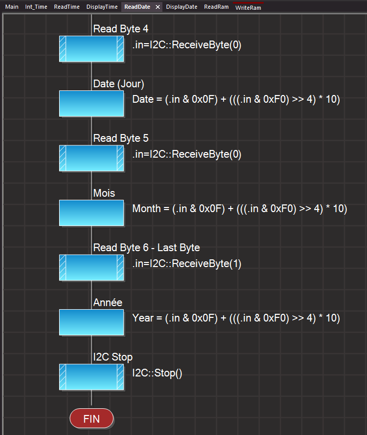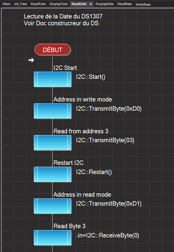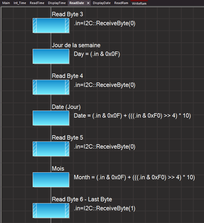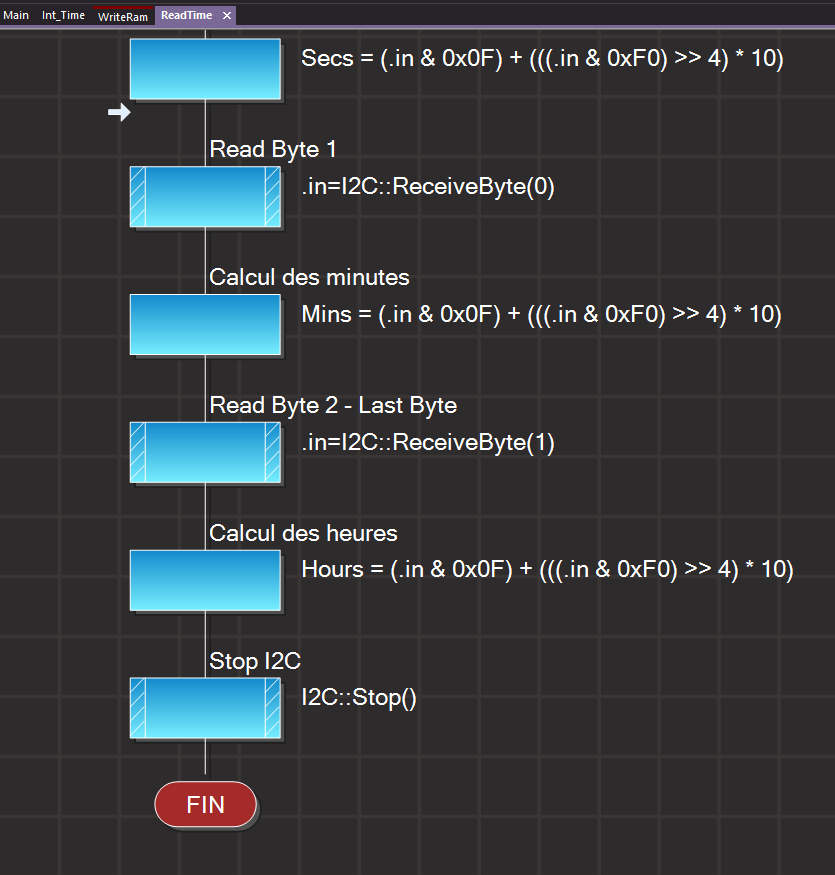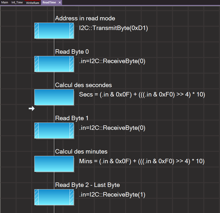 Avant d'afficher l'heure il faut créer une Routine (macro) réalisant la lecture des Secondes (Secs), des Minutes (Mins) et des Heures (Hours). Cette procédure doit donc, comme le montre le tableau ci-dessous, lire consécutivement les Adresses 0x00, 0x01 et 0x02 des registres du DS1307