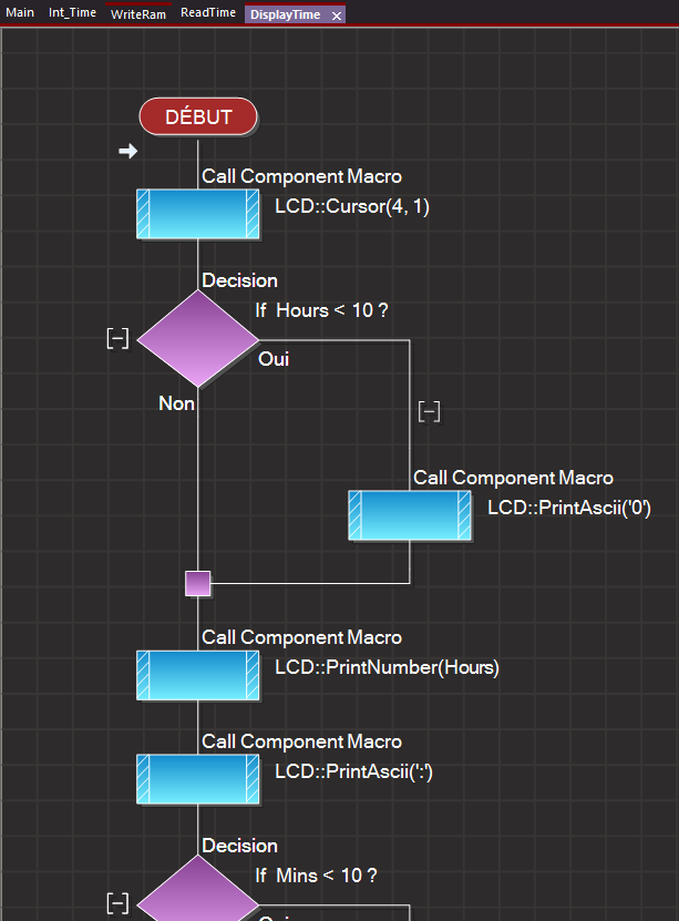 Procédure d'affichage de l'heure, nommée DisplayTime, sur la deuxième ligne de l'afficheur.