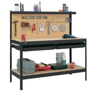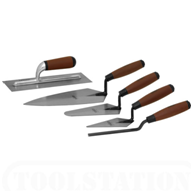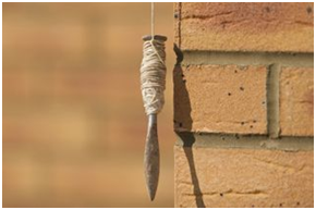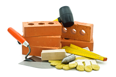 mallet, gloves, trowel, bricks, and a rule meter, plumb line