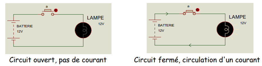 Un circuit électrique est dit passant, ou fermé, lorsqu'un courant électrique circule dans ce circuit. Cela implique qu'il y ait continuité de ce circuit, c’est à dire que le contact établisse le circuit. Un circuit électrique est non passant, ou ouvert, si le courant ne peut pas circuler dans ce circuit. Un circuit électrique comprend au minimum, une source d'énergie, un récepteur et un contact.