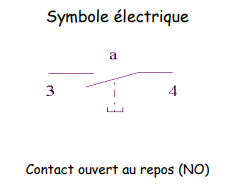 C'est un contact qui est normalement ouvert ( Normally Open ) au repos. Il se ferme lorsqu'il est actionné. On désigne ce type de contact par des lettres minuscules a, b, c... Ses bornes sont repérées par des chiffres.