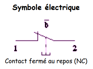 C'est un contact qui est normalement fermé ( Normally Closed ) au repos et qui s'ouvre lorsqu'il est actionné. On désigne ce type de contact par des lettres a, b, c, a/, b/, c/ ( a se lit "a barre"). Ses bornes sont repérées par des chiffres, 1 et 2 ici.