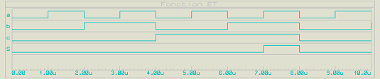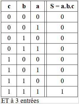 La sortie S est au niveau haut, si a = 1 ET b = 1 ET c = 1 , sinon S est au niveau bas