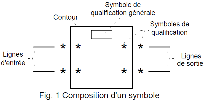 Un symbole comprend un contour ou une combinaison de contours avec un ou plusieurs symboles de qualification (Fig. 1). Le but des symboles de qualification générale est de décrire avec précision la fonction logique de l'élément, et les plus utilisés sont listés dans la Table 1. la direction privilégiée du flux de signal à travers les symboles et les circuits associés est de la gauche vers la droite; les entrées sont à gauche et les sorties à droite.