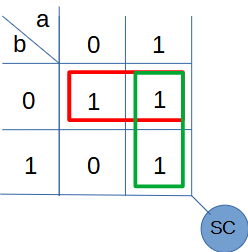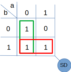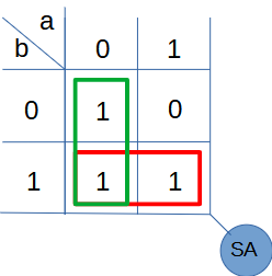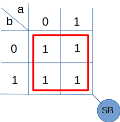Il faut rechercher les variables qui n’influent pas le comportement de la variable de sortie. Dans notre exemple les 1 sont dans une colonne, le résultat va donc dépendre directement de la variable associée à cette colonne, ici "a". La variable de ligne n’a pas d’influence car si a=0 quel que soit l’état de b (0 ou 1), la variable de sortie S reste à 1 .