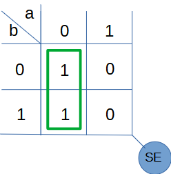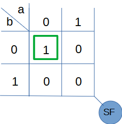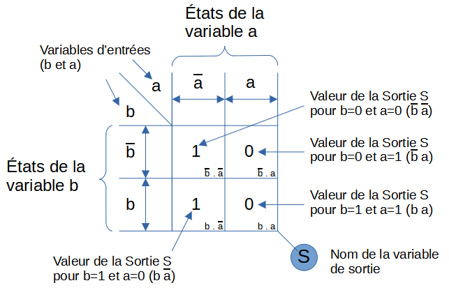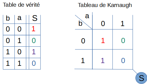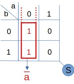 La variable de sortie S est active dans deux cas. Les deux combinaisons de sortie sont respectivement pour b et a, [0,0] ou [1,0]. L’utilisation du tableau de Karnaugh permet de déterminer très rapidement l’équation de la variable S.
