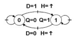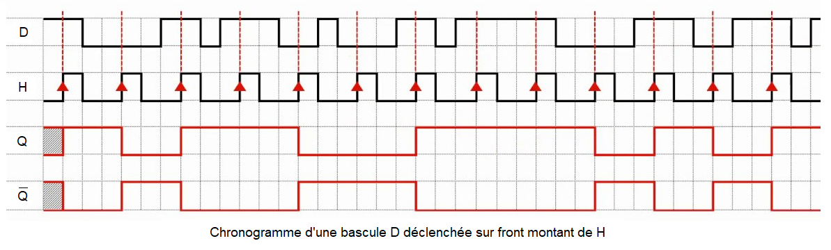 Au front montant (↑H) du signal d'horloge H, la donnée présente sur D est transférée (recopiée) en sortie Qt+ = Dt- . En l'absence de front montant d'horloge, la sortie conserve son état Qt+ = Qt-.