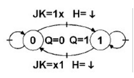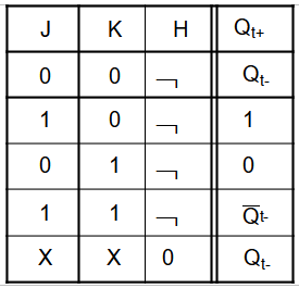 Pour cette bascule aussi, il faut considérer l'état de J et K (à t-) avant le front actif (↓H) pour déterminer l'état de la sortie Q (à t+) juste après le front descendant de H.