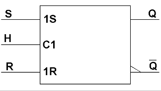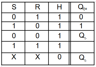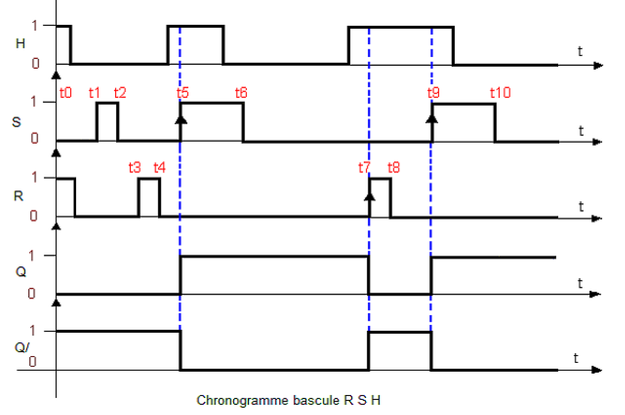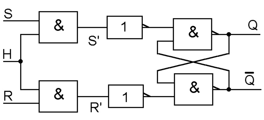 Cette bascule dispose d'une entrée supplémentaire H, qui permet de synchroniser, de valider les entrées de commandes R et S. Lorsque H est active (niveau haut) la bascule est synchronisée et sa sortie évolue en fonction des états de R et de S. Lorsque H est inactive, la sortie ne change pas d'état, les entrées R et S sont donc inhibées afin de placer le bistable à l' état mémoire.