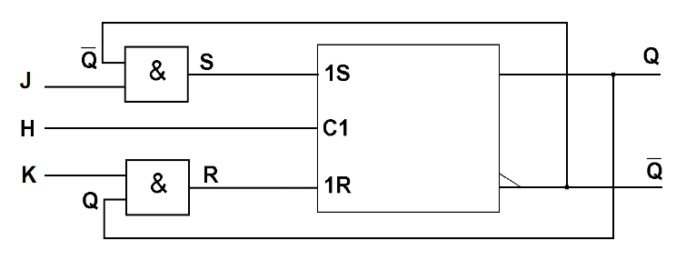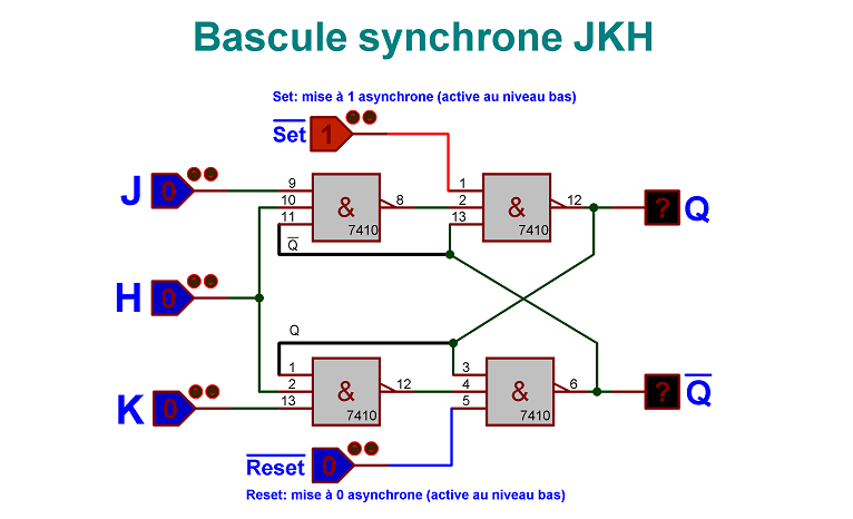 Nous allons donc valider la mise à 0 (appelée K) si la sortie est à 1, et la mise à 1 (appelée J) si la sortie est à 0, ceci à partir d’une bascule RSH.