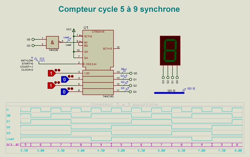 Exemple: Réaliser à l'aide d'un 74HC163 un compteur qui a pour cycle 5,6,7,8,9,5,6,...