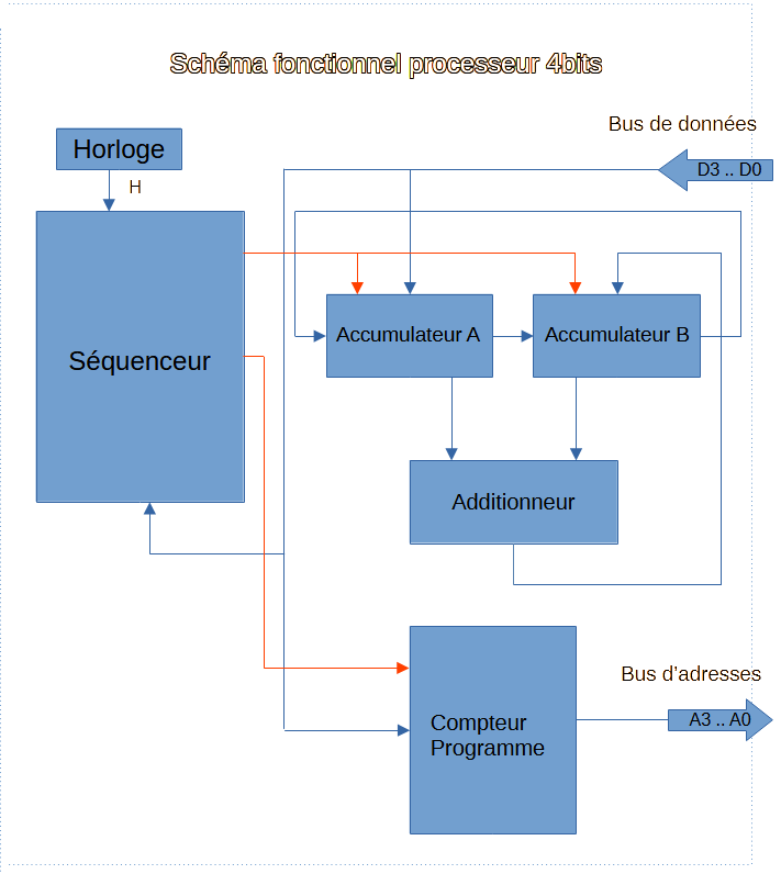 Notre processeur sera donc composé de deux registres A et B, d'un additionneur faisant office de l'UAL (Unité Arithmétique et Logique, en anglais arithmetic logic unit, ALU) d'un compteur ordinal PC (compteur ordinal ou pointeur d'instruction en anglais : instruction pointer IP ou program counter PC) le tout sera piloté par un séquenceur cadencé par une Horloge.