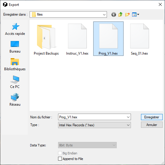 Surtout ne pas oublier d'ajouter l'extension .hex