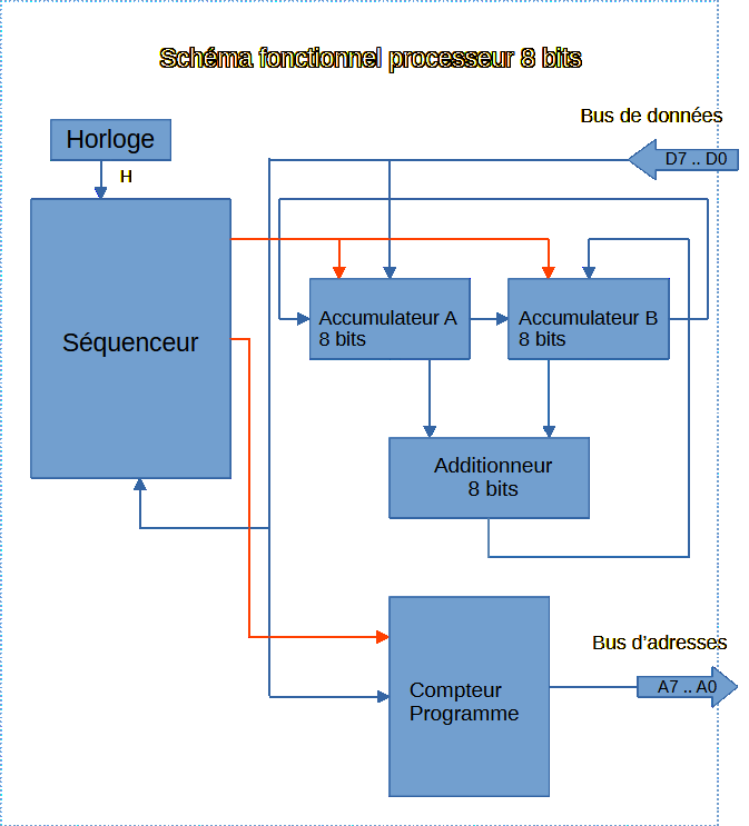 Il faut avouer que notre Processeur 4 bits est limité, alors pourquoi pas un processeur 8 bits, un bus d'adresse de 8 bits, un bus de donnée de 8bits et une addition sur 8 bits.