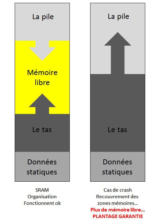 Attention : la SRAM est très limités (2ko) et aucun contrôle n’est fait pour empêcher le débordement de ces zones entre elles.