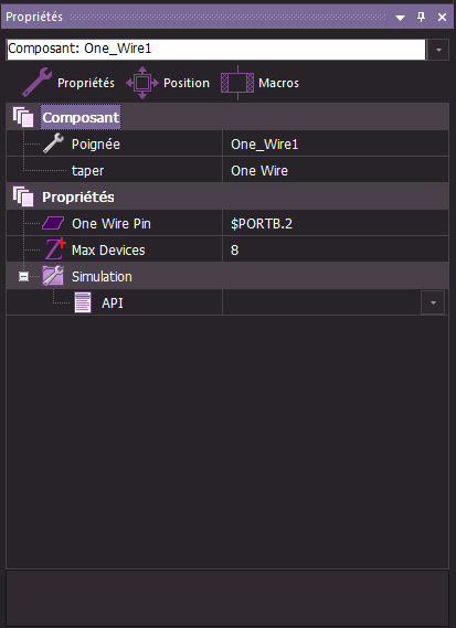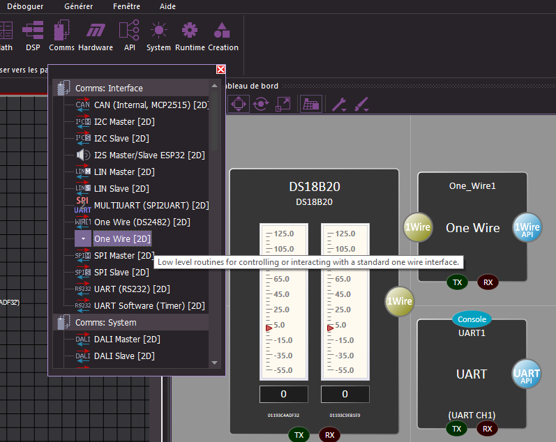 Sous Flowcode, pour utiliser le Bus OneWire à l'aide d'un microcontrôleur, il faut ajouter au "Panneau tableau de bord" un composant de type "One Wire"