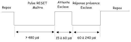 Avant toute communication, le maître met le bus à l’état bas (0V) pendant 480 μs pour faire une initialisation (reset) des composants connectés. Après un délai de 15 à 60 μs, le ou les esclaves connectés, forcent le bus à l’état bas pendant 60 à 240 μs pour signaler leur présence. Le maître est alors informé des esclaves connectés sur le bus.