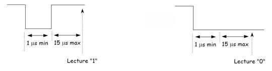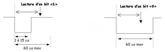 Après la réception d’une commande du maître, l’esclave peut renvoyer des données. Pour lire les données de l’esclave, le maître force le bus à « 0 » pendant au moins 1 μs. Si l’esclave veut émettre un « 1 », il laisse le bus libre, donc tiré à « 1 ». Pour émettre un « 0 », l’esclave doit tirer le bus à « 0 » pendant 15 μs au minimum. Le maître devra donc dans tous les cas lire le bus 15 μs maximum après avoir tiré le bus à « 0 » pendant 1 μs. L’état du bus donnera alors le bit transmis par l’esclave.