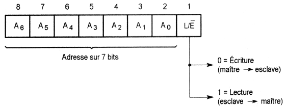 La figure page suivante montre le contenu du premier octet qui est toujours présent en début d’échange. Ces sept bits de poids forts contiennent l’adresse du destinataire, ce qui autorise 128 combinaisons différentes. Le bit de poids faible indique si le maître va réaliser une lecture ou une écriture. Si ce bit est à zéro, le maître va écrire dans l’esclave ou lui envoyer des données. Si ce bit est à un, le maître va recevoir des données de l’esclave.