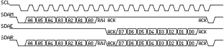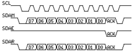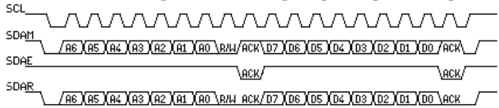 Dans cet exemple : • SCL : Horloge imposée par le maître. • SDAM : Niveaux de SDA imposés par le maître. • SDAE : Niveaux de SDA imposés par l'esclave. • SDAR : Niveaux de SDA réels résultants. |