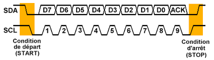 Remarque : dans le cas particulier d'utilisation d'ACK, l'écriture d'un octet dans certains composants (Mémoires, microcontrôleur, ...) peut prendre un certain temps. Il est donc possible que le maître soit obligé d'attendre l’acquittement ACK avant de passer à la suite.